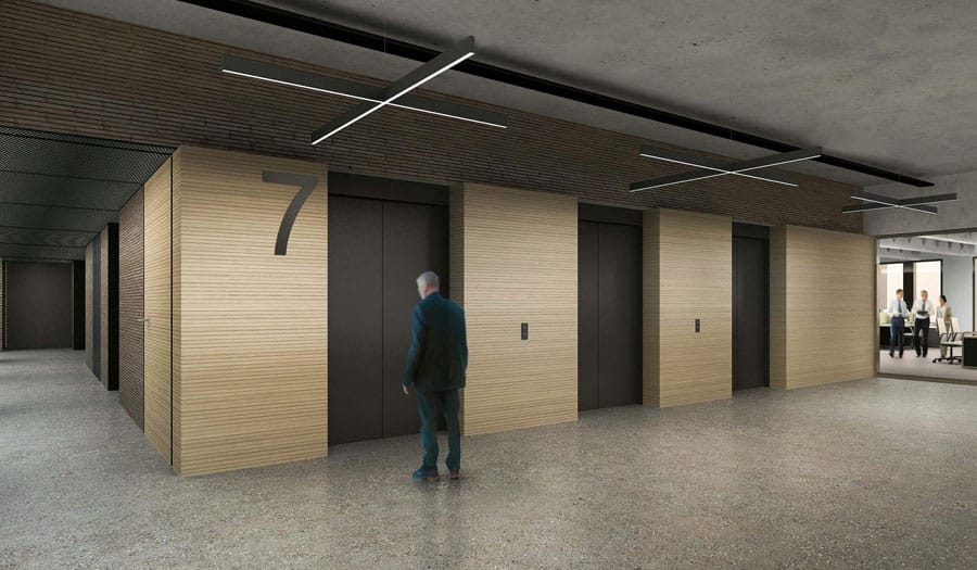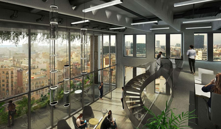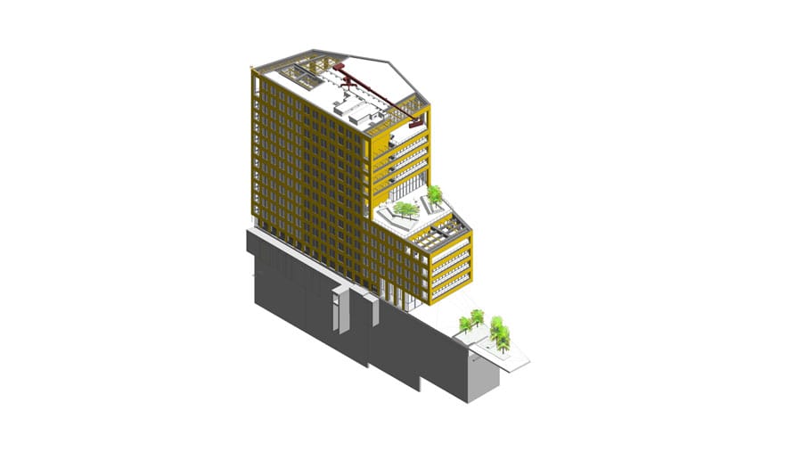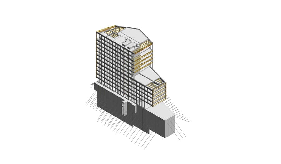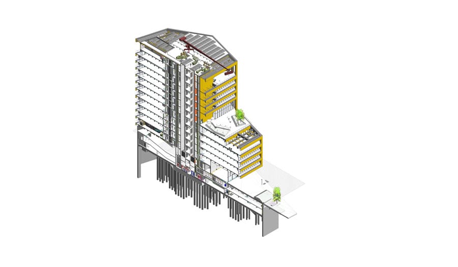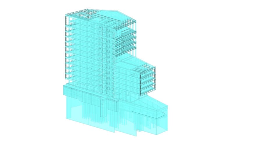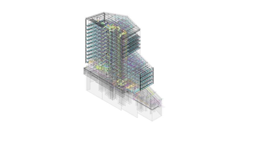 Edificio corporativo con zonas comunes. Se construyó con un sistema estructural mixto. Uno de los desafíos de este proyecto fue desarrollar un asset information model, elaborando un modelo As Built BIM con todas las disciplinas que involucra arquitectura, estructuras e instalaciones tomando en cuenta parámetros para facility management.